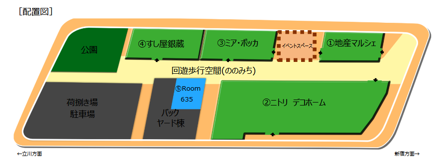 「ムサコガーデン」にはニトリを含め農産物直売の「地産マルシェ」、イタリア料理の「ミア・ポッカ」、「すし屋銀蔵」がオープンするほか、緑あふれる回遊歩行空間「ののみち」や大屋根下のイベントスペース、家族で楽しめる公園が整備されている。