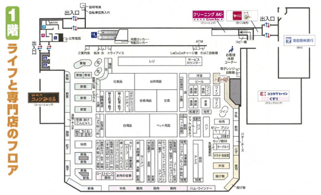 1階の売場は入口から反時計回りのコンコース沿いに、青果、日配、鮮魚、精肉、惣菜、インストアベーカリー「小麦の郷」を配置。中央の奥壁面側に加工食品、レジ側に日用品、ペット用品、学童用品、化粧品、介護用品、そして婦人・紳士の実用衣料、服飾雑貨など、日常使いの売場を揃える。またイートインスペース「Life Café」50席を設ける。