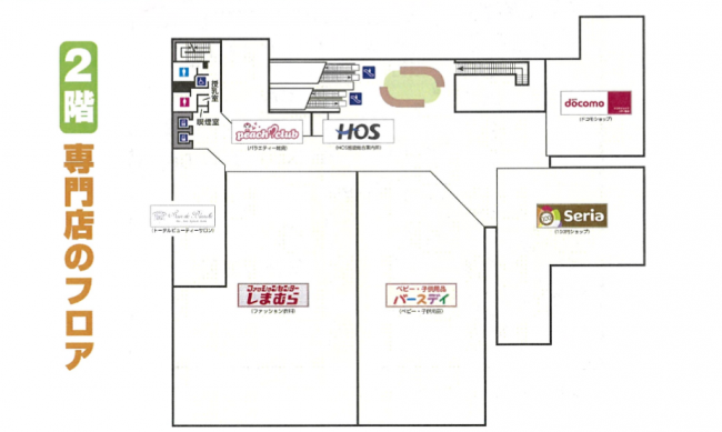 2階 しまむら、バースデイ、セリア、ドコモショップほか