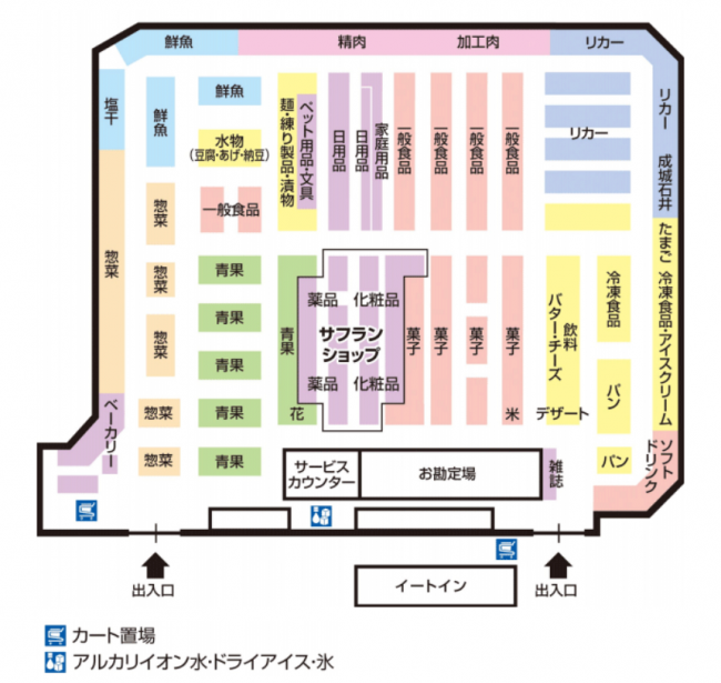 フロア構成は、惣菜売場、ベーカリー売場、農産売場を前面に配置することで、即食ニーズへの対応と、店内に入ったときの鮮度感・ライブ感を感じさせる構造をつくった。農産売場では「もぎたて広場」を設置して、近郊農産物を品揃えする。惣菜売場では即食・簡便・健康・こだわりを意識した商品カテゴリーの拡大を図り、「デリカDEバイキング」を導入している。また、スーパーマーケットの改装ではトレンドの一つとなっているイートインコーナーを、出入り口の外に新たに設けている。
