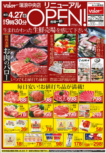(株)バロー(岐阜県多治見市、田代正美社長)は4月27日(金)の今日、スーパーマーケット「バロー瑞浪中央店」をリニューアルオープンした。