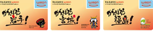 イオンの電子マネー「ご当地WAON」も、利用金額の一部を地方自治体に寄付し、地域活性化に役立ててもらう仕組みになっている。東北では、2012年5月11日に「東北復興支援WAON(岩手・宮城・福島)」を発行したが、2017年度(2017年3月~2018年2月)の利用金額の総額の0.1%に当たる508万1344円(内訳:岩手県156万1518円、宮城県176万5772円、福島県175万4054円)をこの3県に寄付する。
