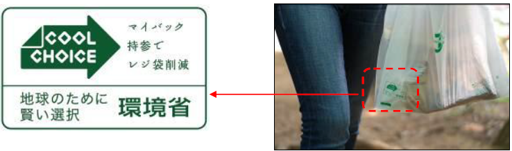 店舗で提供しているレジ袋(有料・無料とも)に「COOL CHOICE」のロゴを掲示し、お客に「マイバッグ持参によるレジ袋削減」を呼びかける。