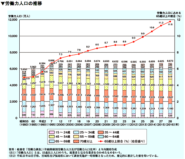 内閣府の「高齢者の就業」に関する調査データによると、労働力人口に占める60歳以上の比率は年々上昇している。2016年の労働力人口6673万人のうち、60歳~64歳は540万人、65~69歳は450万人。労働力人口に占める65歳以上の割合は既に10%を超えていて、高齢化社会とともに社会で活躍するシニア層の増加が顕著になっている。