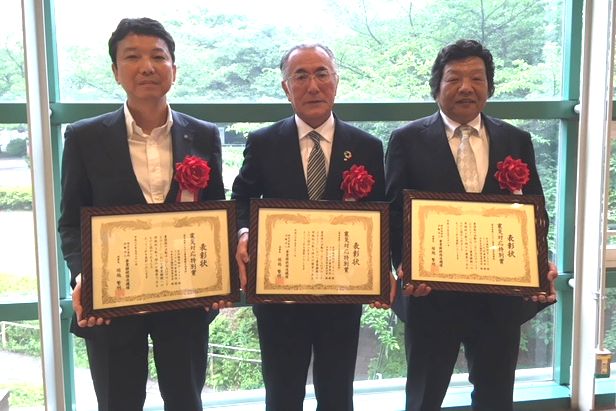 5月31日に、国立オリンピック記念青少年総合センターで行われた表彰式には、生協くまもとの吉永章代表理事理事長(中)、コープ九州の江藤淳一代表理事理事長(右)、日本生協連の山本克哉常務理事(左)が出席した。