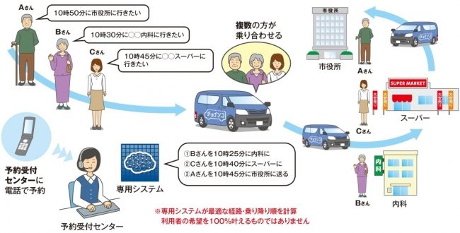 この実証実験は、指定地区から豊明市内・近郊の医療機関を中心とした指定停留所への送迎サービス。事前に複数の利用者の希望目的地・希望到着時刻を専用システムで計算し、効率的な送迎サービスを運行する。
