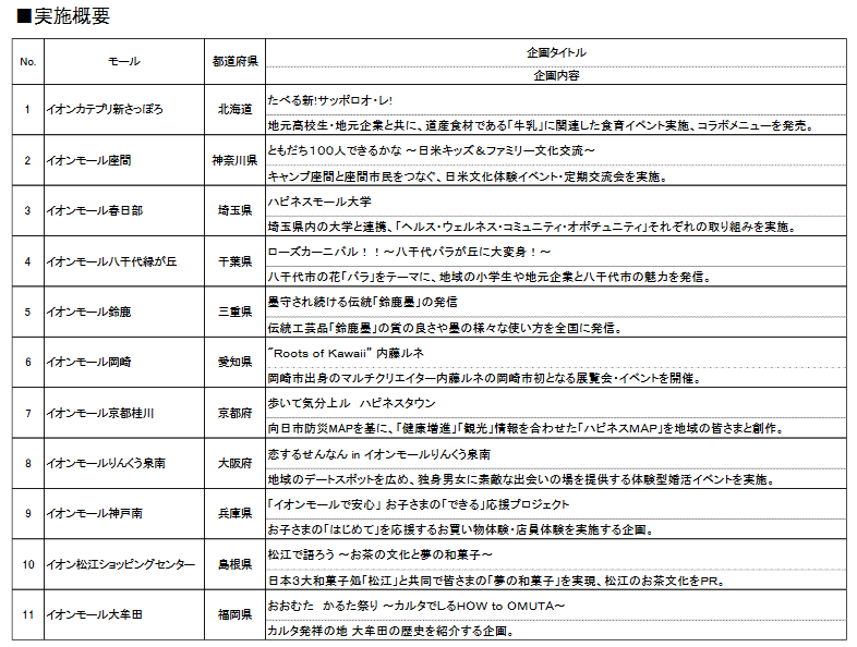 2018年のテーマを「人々が集い、笑顔が生まれて、地域の新しい元気をつくる “ハピネスモールの実現”」とし、全国のモールで勤務する若手社員やパート社員が考案した259企画から11企画を厳選した。それぞれのモールが立地する地域の魅力を、「産」(企業)、「学」(教育機関)、「官」(行政)、「民」(団体)、「文」(文化・歴史)、「品」(産品)の6ジャンルとコラボレーションし、地域とともに “暮らしの未来” を創造する活動としている。