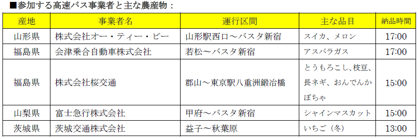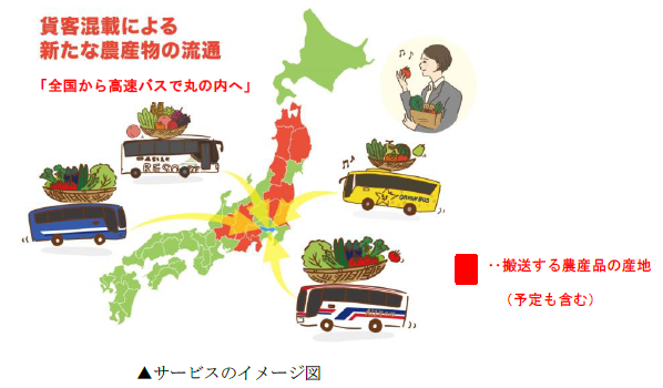 具体的には、複数のバス会社と連携して、各地方から東京への旅客用高速バスのトランクスペースにその地方の新鮮な農産物を積み込み、東京都市部で乗客を降車させた後に、丸の内エリアに納品するというもの。