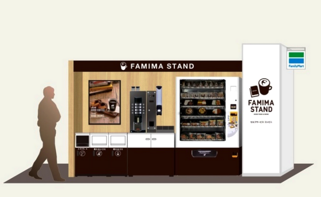 FAMIMA STANDは、おむすびやパン、菓子などを購入できる自販機コンビニのASD(オートマチック・スーパー・デリス)と、ファミマ初となる、挽き立てコーヒーの自販機型のコーヒーマシンが設置されたコーナーだ。京王電鉄(株)との取り組みで、京王線仙川駅ビルのリニューアルに併せて初導入された。営業時間は10:00から23:00まで。