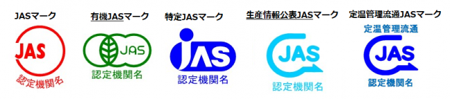 第1は、「一般JAS規格」で、円とJASの文字を組み合わせた一般的なデザインのJAS規格。