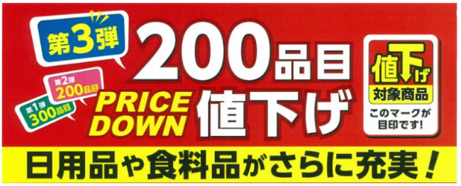 第3弾の今回は、日用品やペット用品、一般食品などに値下げアイテムを拡げる。