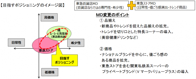 新業態は、百貨店業態の持つ専門性・希少性のある商品と、スーパーマーケット業態が得意とする幅広い品揃えと値ごろ感のある商品を、地域特性やお客ニーズに合わせて、柔軟に組み合わせていく。つまり百貨店、スーパーマーケットの両業態を持つ東急グループの強みを活かした展開となる。