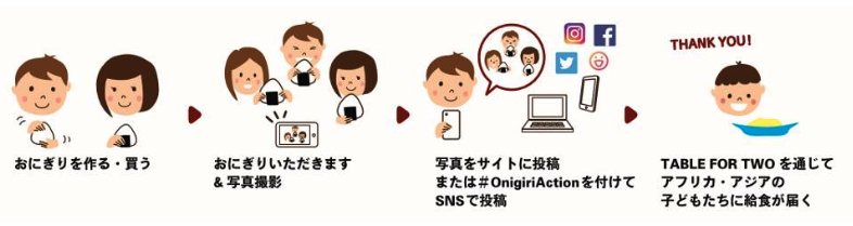 また「おにぎりアクション2018」では、おにぎりの写真にハッシュタグ「#OnigiriAction」をつけたSNSや、TFTの特設サイトに写真を投稿すると、写真の枚数に応じて協賛企業・団体から、アフリカ・アジアの子どもたちに給食が届けられる。