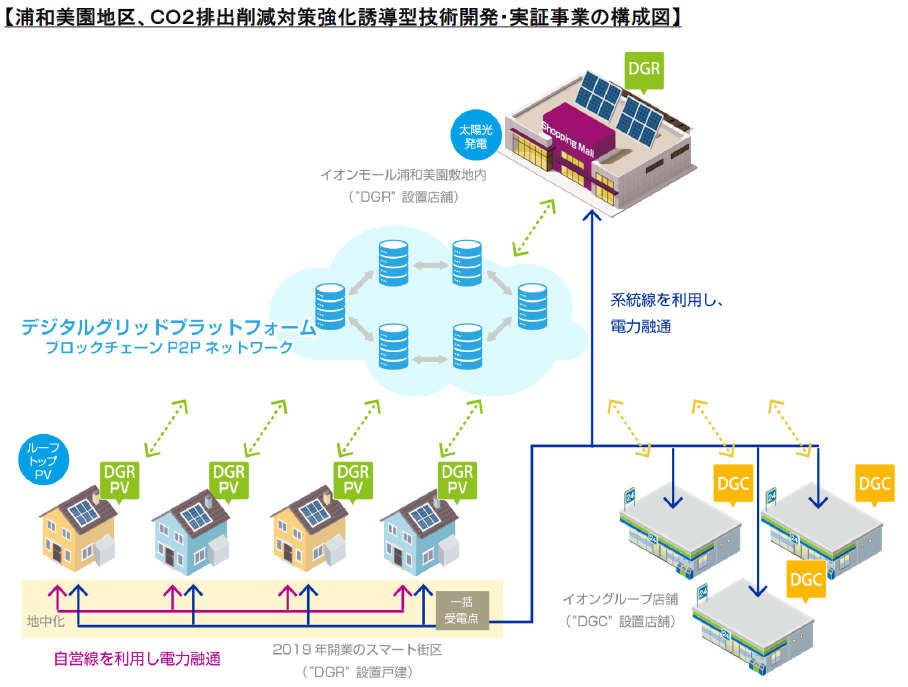 ブロックチェーンを用いた電力融通決済システム上において、仮想的な電力融通取引を行う。デジタルグリッドおよびイオンディライト(株)とともに取り組む今回の実験には、埼玉県さいたま市の「イオンモール浦和美園」やスマートコミュニティ街区の戸建て住宅、さいたま市内のミニストップ5店舗も参加する。