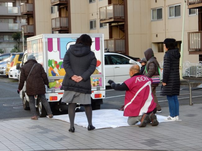 天王町店からイオン移動販売と書かれた特注車1台と一般車1台が団地前の庭に到着する。その到着を待ちわびたように、団地に住む社会調査協議会の人たちが、車を誘導する。ここでは、協議会の人たちの協力を得て販売する。