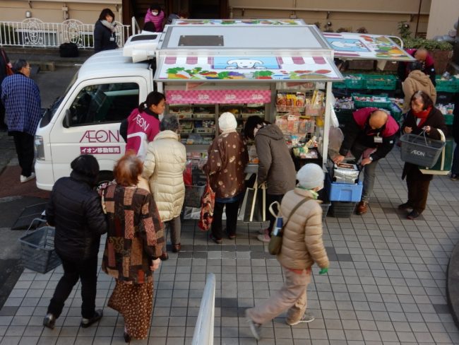 きっかけは2011年の東日本大震災だ。宮城県の気仙沼や石巻の被災地を、車に商品を積み込んで巡回販売した。その後、移動販売車を開発して、千葉県、神奈川県などで展開している。自治会や地元の協力を得ながら、買物が不便な地区の集合住宅や老人ホーム、戸建ての庭などで販売する。