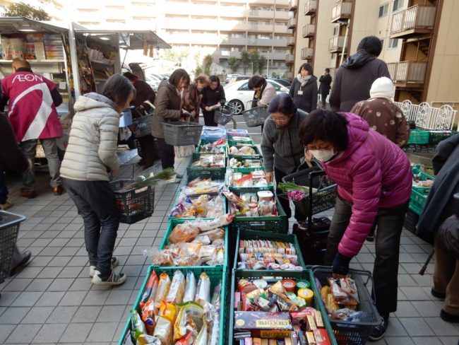 師走の28日(金)に巡回するのは、横浜市西区にある集合住宅「三ツ沢ハイタウン」だ。三ツ沢ハイタウンは横浜駅から車で10分ほどの小高い丘の上にある。開発されて50年ほどが経つ集合住宅で、高齢者が多く居住している。周辺には全日食チェーン加盟店とコンビニしかない。しかもそれらの店は丘を下らないとない。高齢者には日常の買物が不便なエリアだ。