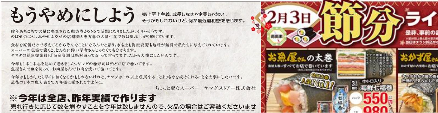 兵庫県内で8店舗を展開する「ヤマダストアー」は、2018年2月、「恵方巻」などを広告した折り込みチラシに「もうやめにしよう」というメッセージとともに、「今年は全店、昨年実績で作ります」、「欠品の場合はご容赦くださいませ」という文章を添えて発信した。