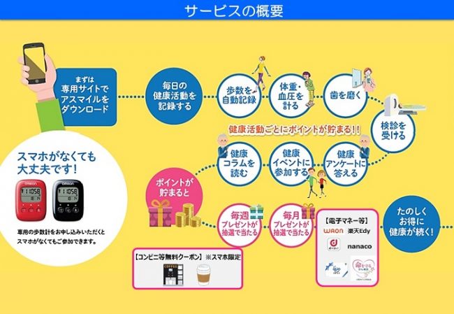 このプラットフォームは大阪府が府⺠の健康促進と、医療費等の削減を目的にを立ち上げた。18歳以上の府内在住者なら誰でも参加できる。専用スマートフォンアプリ「アスマイル」をダウンロードして、ウォーキングや特定健診の受診、健康イベントへの参加などの健康行動を行うと、その結果にポイントが付与される。一定のポイントが貯まると、抽選に参加することや電子マネーなどの特典と交換できる。