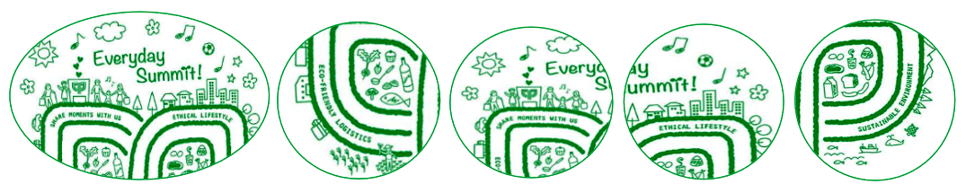 新デザインは、事業ビジョン「サミットが日本のスーパーマーケットを楽しくする」を表現したもので、一つひとつの絵にメッセージ性が込められた。ストーリーは社会や環境のなかでの循環を表している。