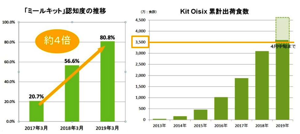 2019年3月に、関東エリア在住の20代~50代の女性1000名を対象に、同社でウェブアンケ―ト調査を行ったところ「ミールキット」を知っているという割合が8割を超えた。2017年3月に比べると、その認知度は2年で4倍にも上がった。仕事や子育てで忙しい女性を中心にSNSなどで広がり、売上げが増加している。