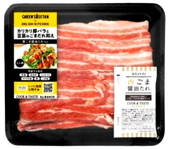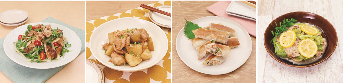商品は、カリカリ豚バラと豆苗のゴマだれ和え(香ごま醤油たれ)、鶏肉とじゃがいもの照り煮(香ごま醤油たれ)、豚ニラもやしのスタミナ春巻き(こく旨醤油たれ)、豚バラとキャベツのレモンバター蒸し(こく旨醤油たれ)で、4品とも小売希望価格各税別398円。