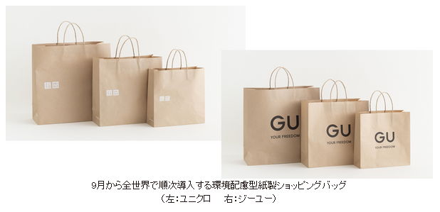 またエコバッグの利用促進のために、日本国内のユニクロとジーユーでは、2020年1月14日から全店舗でショッピングバッグを1枚一律10円(税抜)と、有料化する。欧州、北米、韓国など海外16カ国・地域のユニクロとジーユーでも、2019年9月以降にそれぞれショッピングバッグを有料化していく。