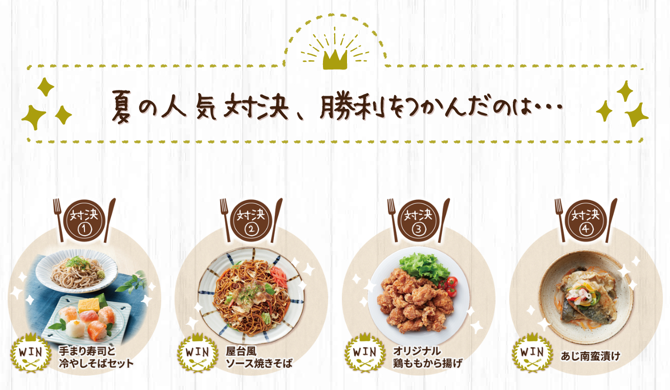 対決は「冷やし麺セット対決」「粉もん対決」「から揚げ対決」「さっぱり涼味対決」の4カテゴリー。