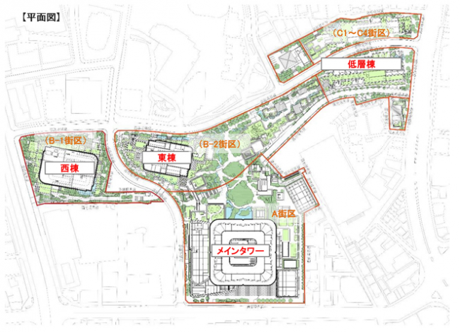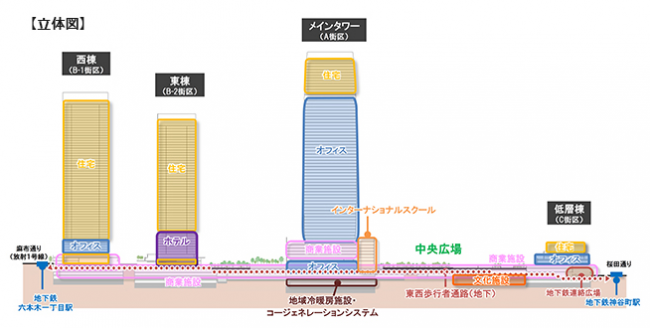 主要用途/住宅(約1400戸)、事務所(約21万3900㎡(6万4818坪))、店舗(約150店)、ホテル(約120室)、インターナショナルスクール(約1万4000㎡)、中央広場(約6000㎡(1818坪))、文化施設(約9000㎡(2727坪))等