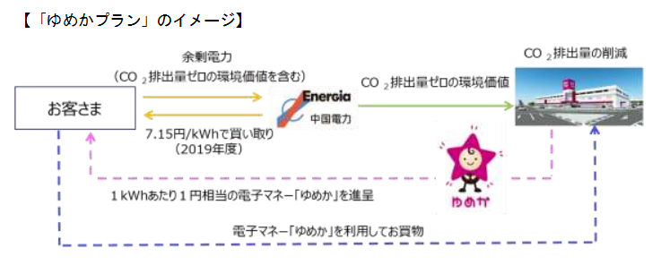 「ゆめかプラン」は、中国電力が、家庭の太陽光発電による余剰電力を買い取り、買い取った余剰電力に含まれるCO2排出量ゼロの環境価値を、イズミの店舗へ提供することで、中国電力の定める買取単価(2019年度は税込7.15円/kWh)による買い取りに加え、1kWh当たり1円相当の電子マネー「ゆめか」を進呈するサービスだ。