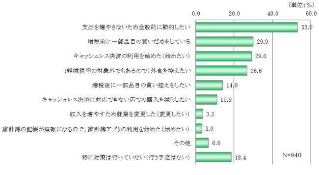 「支出を増やさないため全般的に節約したい」が53.0%で最多。次いで「増税前に一部品目の買いだめをしている」が29.9%、「キャッシュレス決済の利用を始めた(始めたい)」が29.0%、「(軽減税率の対象外でもあるので)外食を控えたい」が26.6%の順となった。