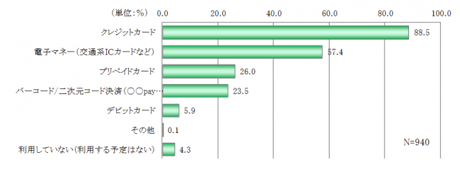 「クレジットカード」が88.5%で最多、次に「電子マネー(交通系ICカードなど)」「プリペイドカード」「二次元コード(〇〇payなど)」の順になった。またスマホの「二次元コード」決済は、高年収世帯や若い世代ほど関心が高い。30代子育て世帯の44.6%が「二次元コード」決済を「利用している(したい)」と回答している。