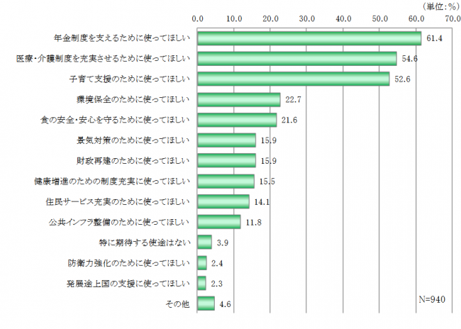 「年金制度を支えるために使ってほしい」が61.4%で最多、次に「医療・介護制度を充実させるために使ってほしい」54.6%。「子育て支援のために使ってほしい」は全体では52.6%だが、30代子育て世帯だけで見ると8割に上っている。社会保障制度への使途を期待する回答が上位にあがってきている。