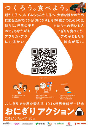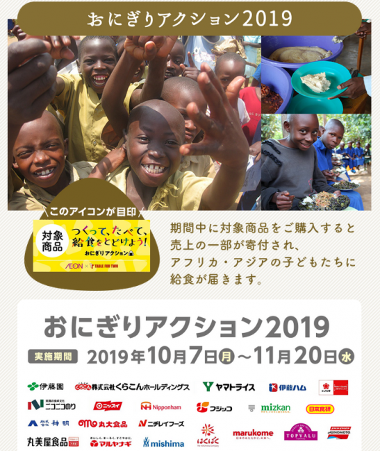 イオン(株)(千葉市美浜区、岡田元也社長)は、特定非営利活動法人TABLE FOR TWO (東京都、小暮真久社長、略称:TFT)が主催する10月16日(水)の「世界食料デー」を記念して、10月7日(月)から11月20日(水)までの期間、「おにぎりアクション」を開催する。
