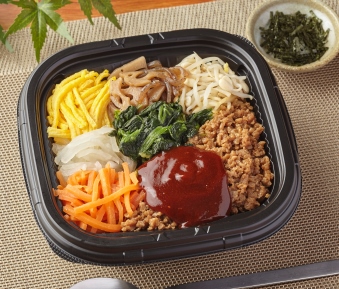 第1は、一つの商品で栄養バランスが整った弁当を開発・発売する。10食品群のうち7食品群が揃ったビビンバ丼498円(税込)の開発がそれだ。10食品群とは、肉、魚介類、卵、牛乳・乳製品、大豆・大豆製品、緑黄色野菜、海藻類、果物、いも、油脂のこと。弁当一つに主食・主菜・副菜が揃っていて栄養バランスも良く、また混ぜ合わせることで高齢者には食べやすい弁当だ。