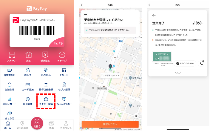 PayPayアプリの「タクシー配車」をタップし、サービス利用の同意後に行き先を入力すると、タクシーが配車されるという仕組みだ。