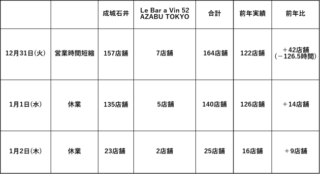 (株)成城石井(横浜市西区、原昭彦社長)は、「成城石井」175店舗とワインバー「Le Bar a Vin 52 AZABU TOKYO」7店舗の大晦日の営業時間を短縮し、年始の休業店舗を増やすと発表した。