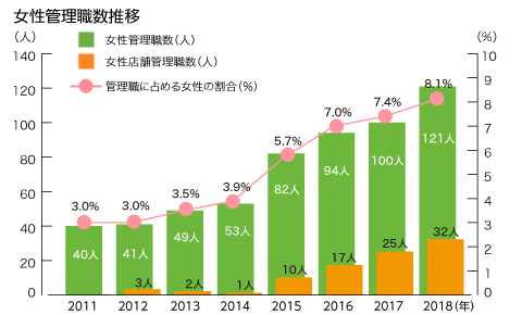 たとえば、女性の活躍をサポートするため2012年4月に岩崎高治社長直轄で女性活躍推進プロジェクトを発足させ、経営上の最重要テーマのひとつとして取り組み、翌2013年10月には専任部署を創設。これにより女性管理職登用が進んだ。