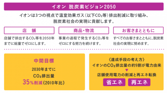 イオンは、2008年に日本の小売業として初めてCO2の排出量削減目標を定めた「イオン温暖化防止宣言」を発表。2018年には「イオン脱炭素ビジョン2050」を策定し、店舗で排出するCO2等を2050年に排出総量でゼロにすることを目指している。