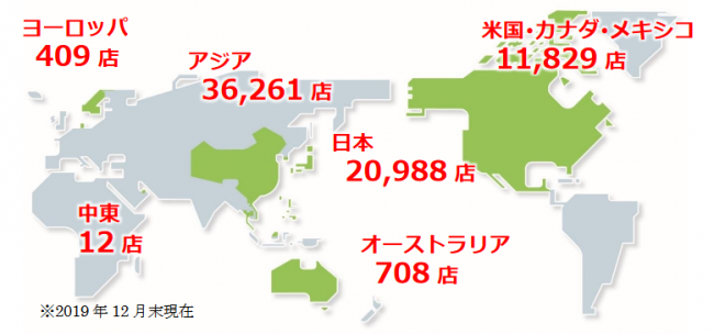 2019年12月末時点で、全世界での総店舗数は7万0207店。地域別では、米国・カナダ・メキシコ1万1829店、アジア3万6261店、オーストラリア708店、ヨーロッパ409店、中東12店、そして日本は2万0988店となっている。