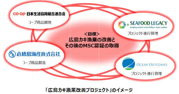 このプロジェクトでは、コープ商品で使用する広島県産カキを育てる漁業者を対象に、2021年度中のMSC認証取得を目指し、カキ漁業の改善活動に取り組む。カキ商品の主力取引先である倉橋島海産(株)、国内外の漁業や水産市場をより持続可能にするために活動している(株)シーフードレガシー、そしてオーシャン・アウトカムズの3者と協働して進める。オーシャン・アウトカムズは漁業・養殖改善プロジェクトの実施などを通じて漁業や養殖業を支援する国際環境NGOだ。