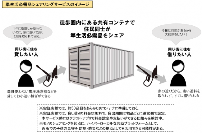 実験では、下北沢駅から徒歩5分、敷地面積1400平方メートル(424坪)の「下北線路街 空き地」に共有コンテナを1台設置する。両社が約50品目の物品を用意し、モノを使用したい借主に貸し出す。これを起点として、シェアリングサービスの潮流をつくり出す。そのプロセスの中から貸し出し需要の高いモノや利用率などのデータを収集し、生活者同士の貸し借りがいかに生まれるかを検証する。利用者にとって利便性や効率性が高まる試みを模索していく。