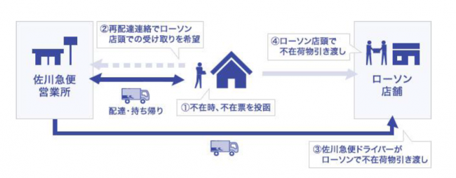 実験では、栃木県の対象エリア内で佐川急便の配達員が投函する不在票に、不在再配達荷物のローソン店頭受け取りの選択肢を追加する。不在再配達荷物は、佐川急便の営業所から店舗に配達される。お客は、店舗で不在票と引き換えに、不在再配達荷物を受け取ることができる。
