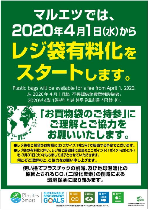 (株)マルエツ(東京都豊島区、古瀬良多社長)は「使い捨てプラスチック」削減のため、レジ袋の無料配布を3月31日(火)に終了する。そして4月1日(水)から、マルエツ、マルエツプチ、リンコス、魚悦の全店でレジ袋の有料化をスタートする。