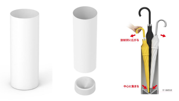 この傘立てはスチール製の円筒パーツと底受け部のパーツのみの最小限でシンプルなデザイン。底受け部をすり鉢形状にしたことで、傘の収納時に持ち手同士の間隔が広くなり、傘同士が絡まりにくく取り出しやすい仕組みになっている。また底部には吸水・乾燥機能に優れた珪藻土を使用している。