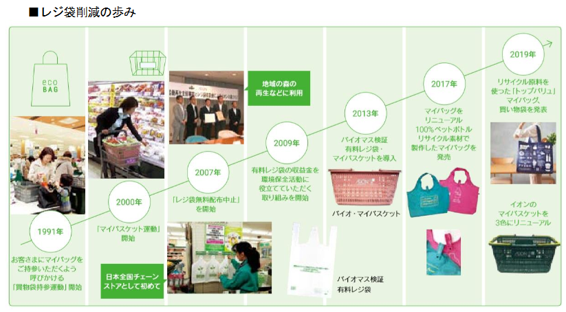 イオンは1991年から「買物袋持参運動」を推進し、レジ袋の削減に取り組んできた。2007年からは食品売場のレジ袋無料配布を中止した結果、実施店舗での辞退率は約80%を超えている。