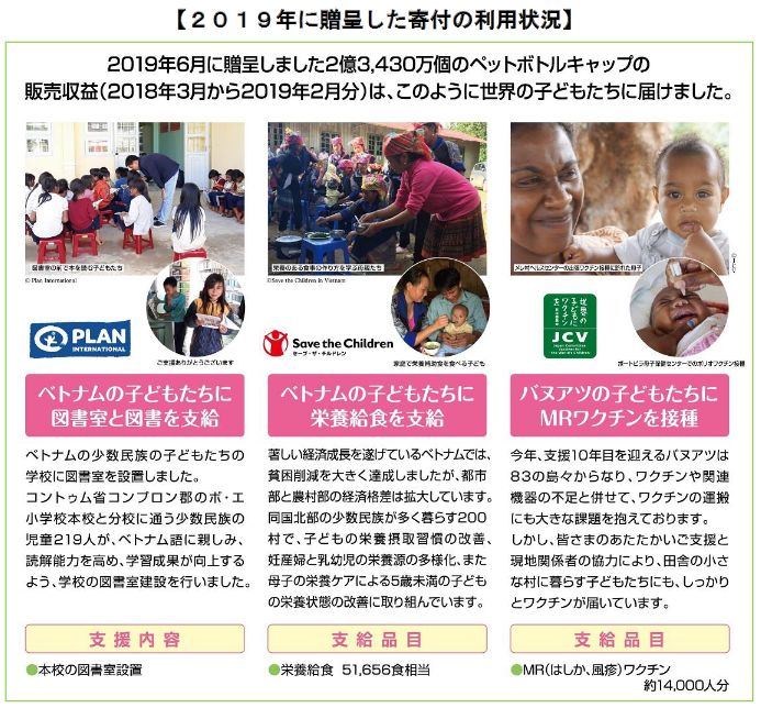 イオンでは2008年から「ペットボトルキャップで世界の子どもたちに笑顔を!!」キャンペーンを実施しているが、2020年2月までに集められたペットボトルキャップは累計約23億4587万個、寄付金総額は2922万9772円に上っている。
