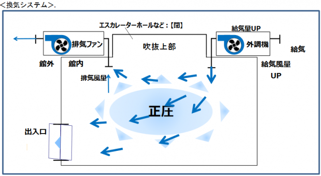 現在、イオンモールでは館内のエアーバランスを正圧とし、「給気風量>排気風量」にすることで出入口からの外気の流入を抑制している。フィルターを搭載している外調機できれいな空気を館内に供給することに加え、外調機のインバーター制御によって、館内のエアーバランス正圧を維持しながら風量を抑え、省エネ運転を実施している。「正圧」とは、室内の空気の圧力が外の空気より高い状態のこと。室内の空気がいっぱいになることで圧力が高く、室内に空気を入れない働きがあり、汚れた空気が入らない。