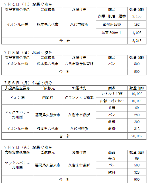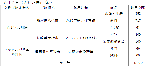 イオン(株)(千葉市美浜区、吉田昭夫社長)グループでは、九州全域で発生した記録的豪雨の被災地の行政の要請に基づいて、第2弾となる支援物資を配送した。