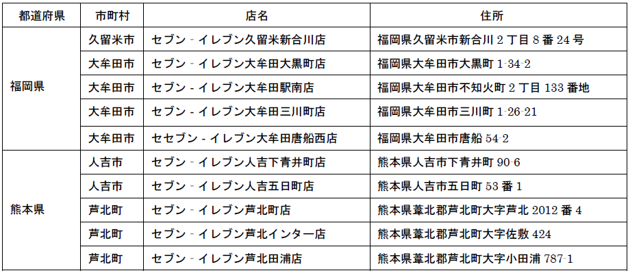 福岡県が久留米市1店舗、大牟田市4店舗、熊本県が人吉市2店舗、芦北町3店。